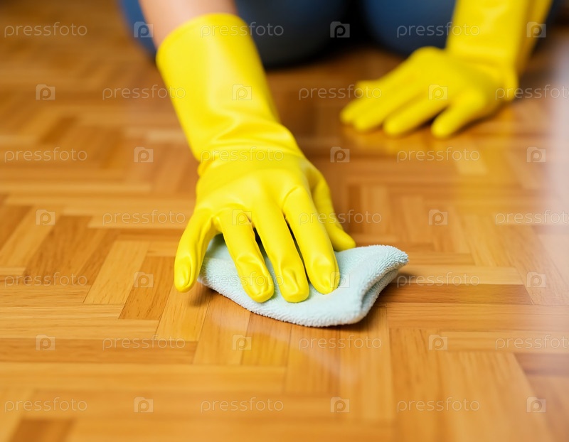 Мужчина в ярко-желтых резиновых перчатках усердно очищает паркетные полы мягкой тканью, гарантируя, что каждый уголок блестит в привлекательной атмосфере гостиной