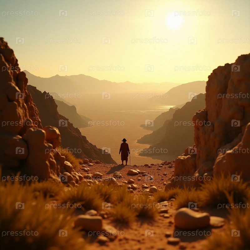 Одинокая фигура исследует суровые пейзажи, где процветала древняя еврейская культура, окруженная величественными горами и теплым светом заката солнца, освещающего горизонт