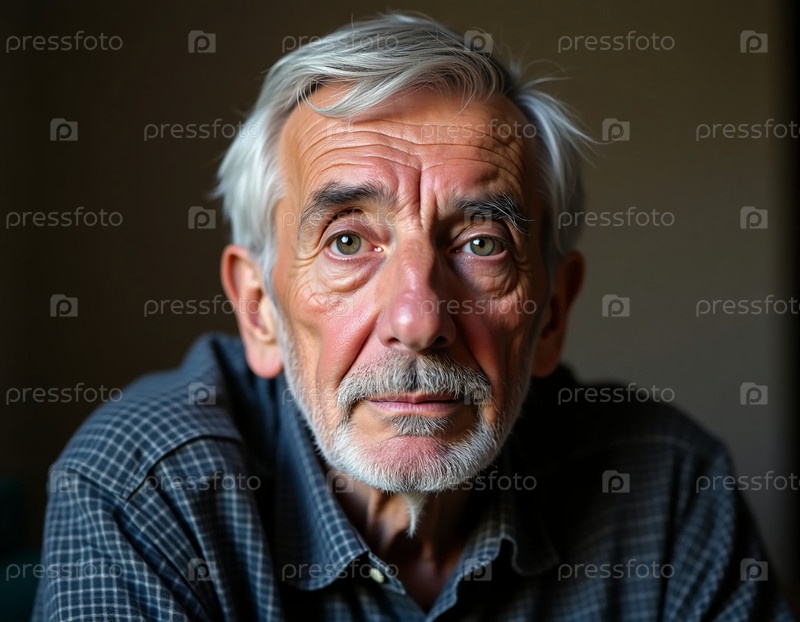 Пожилой человек смотрит созерцательно в нежно освещенной комнате, его мудрые глаза передают всю жизнь историй, воспоминаний и размышлений о своем богатом прошлом
