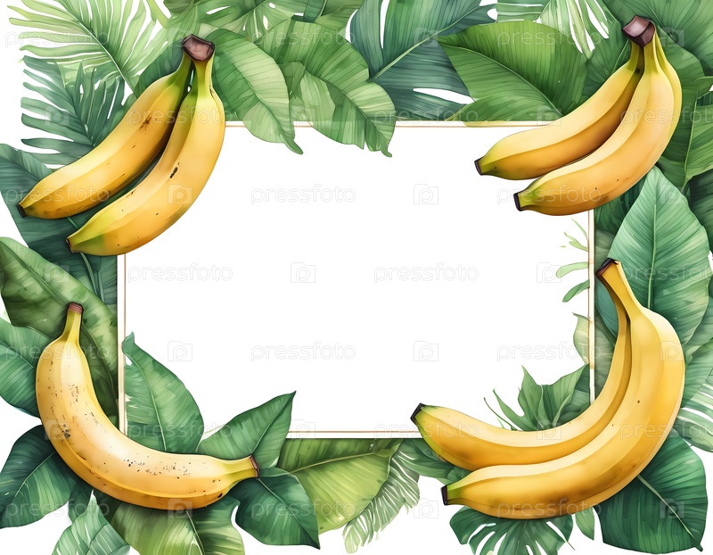 Уникальное банановое акварельное искусство, окруженное пышными зелеными листьями, предлагает идеальный макет плаката с пустым пространством для персонализации генеративного ИИ