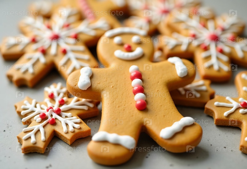 Красочные имбирные печенье и элегантные снежинки отдыхают на столешнице кухни, воплощая веселый дух рождественской выпечки в праздничный сезон генеративного ИИ