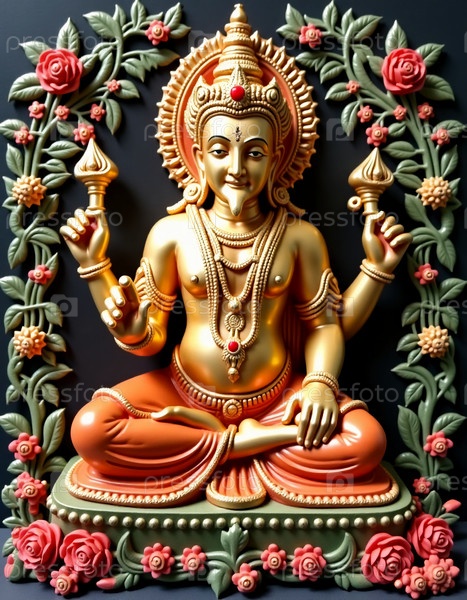 Потрясающая статуя изображает божественную фигуру, украшенную богатыми оттенками, в окружении сложных цветочных рисунков генеративного ИИ