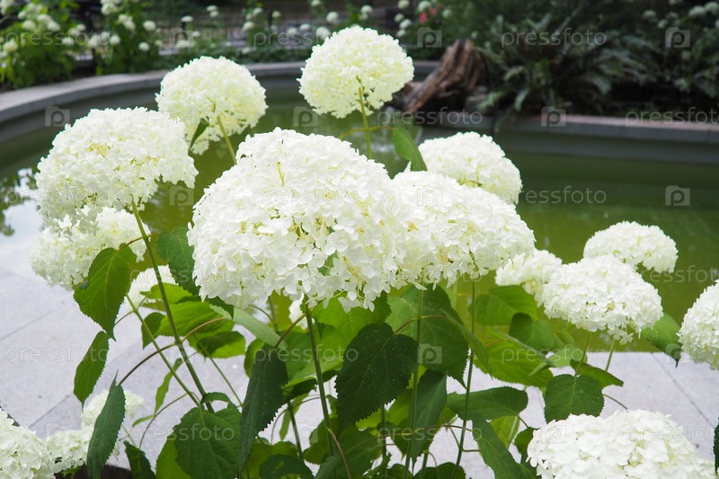 Hydrangea hortensia - род цветущих растений, родом из Азии и Америки.Гортензия является популярным декоративным растением, выращиваемым благодаря своим большим цветникам.Большие белые цветы в саду