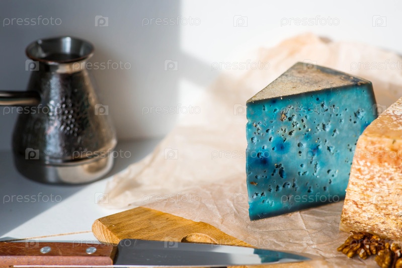 Кусок голубого и желтого, свежего, созревшего натурального фермерского сыра с лавандой и орехами на деревянной доске