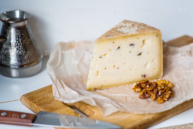 Качество сельскохозяйственной продукции - это свежесть сельскохозяйственных продуктов. кусок свежего, созревшего натурального фермерского сыра с грецкими орехами на пергаменте на деревянной доске