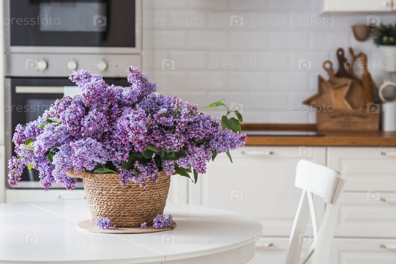 Концепция весеннего домашнего комфорта и отдыха.Большой фиолетовый букет сирен в плетеновой корзине на столе.На заднем плане интерьер современной белой кухни