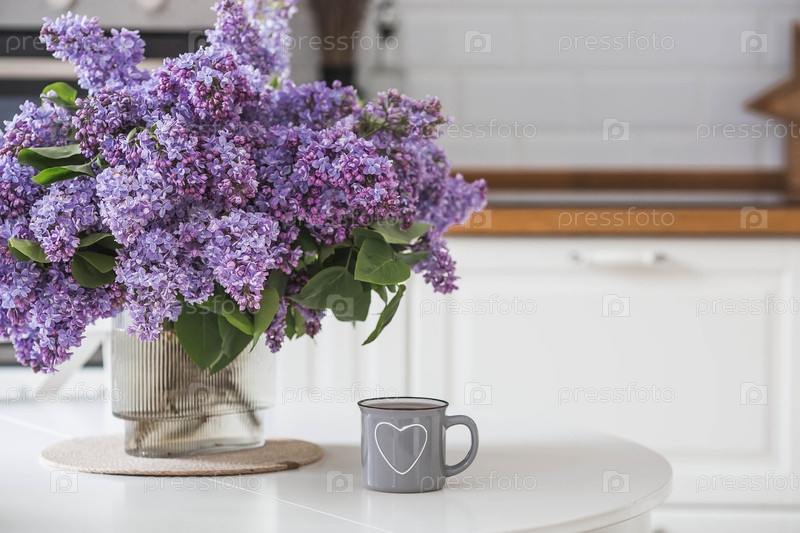 Концепция домашнего комфорта. Большой фиолетовый букет лиловых цветов и чашка чая на столе. На заднем плане интерьер современной белой кухни