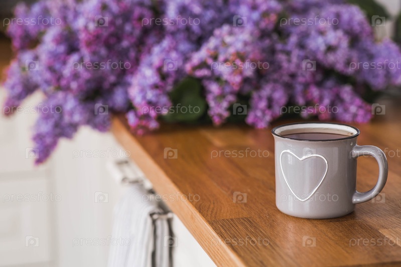 Серая чашка чая или кофе с сердцем на столешнице кухни На заднем плане большой фиолетовый букет сирен