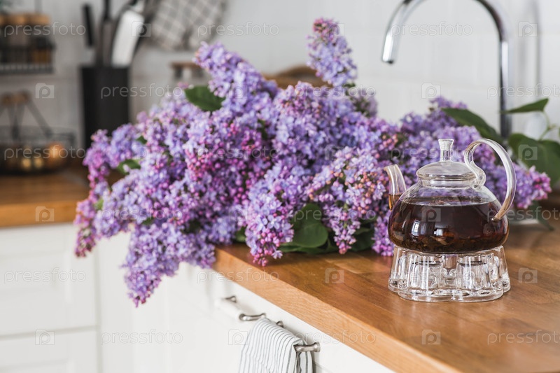 Стеклянный чайник на столешнице кухни.На заднем плане большой фиолетовый букет сирен.Концепция домашнего комфорта и напитков