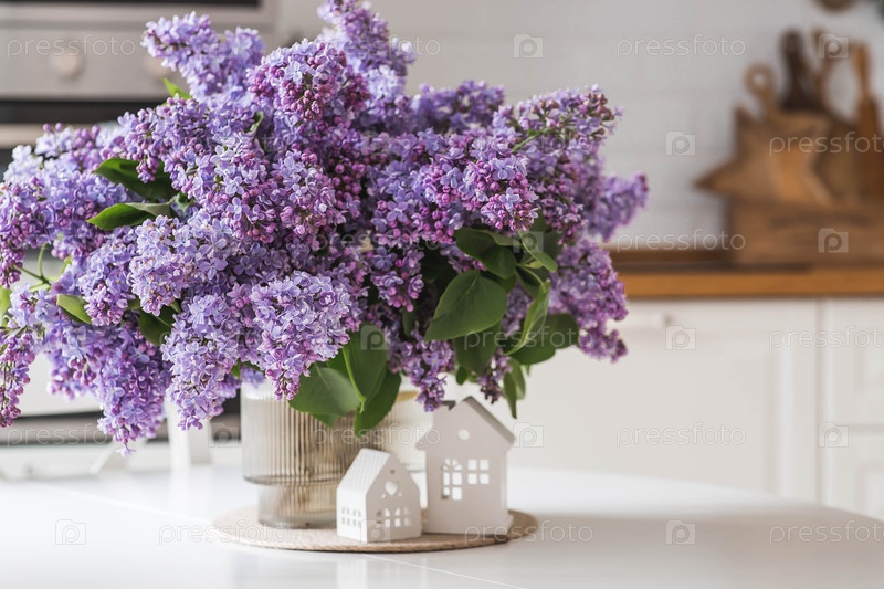 Концепция домашнего комфорта. Большой фиолетовый букет сирен и белых скандинавских домов на столе. На заднем плане интерьер современной белой кухни