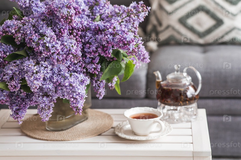 Концепция домашнего комфорта. Большой фиолетовый букет сирен, чашка чая и чайник на столе. На заднем плане интерьер современной гостиной