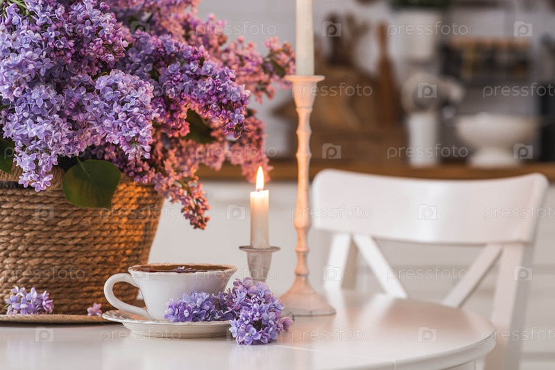 Большой фиолетовый букет сирен в плетеновой корзине, чашка чая и свечи на столе.На заднем плане интерьер современной белой кухни