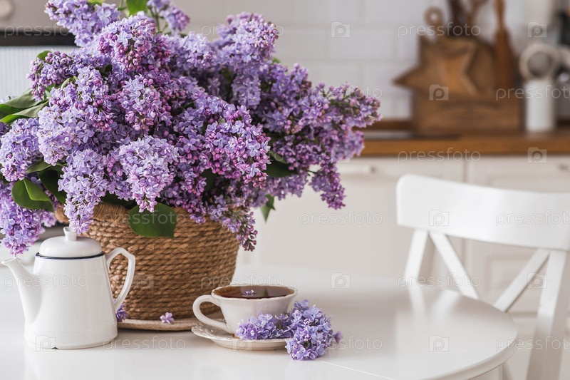 Концепция домашнего комфорта.Большой фиолетовый букет сирен в плетеновой корзине, чайник и чашка чая на столе.На заднем плане интерьер современной белой кухни