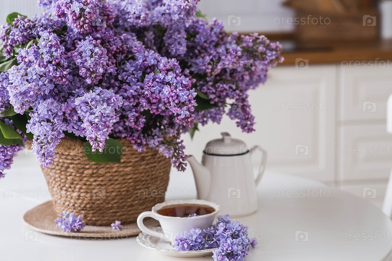 Концепция домашнего комфорта.Большой фиолетовый букет сирен в плетеновой корзине, чайник и чашка чая на столе.На заднем плане интерьер современной белой кухни