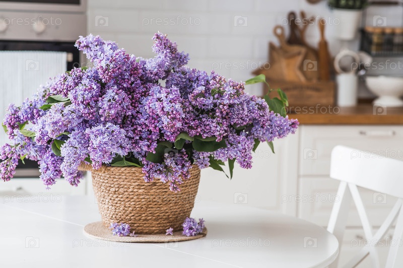 Концепция весеннего домашнего комфорта и отдыха.Большой фиолетовый букет сирен в плетеновой корзине на столе.На заднем плане интерьер современной белой кухни