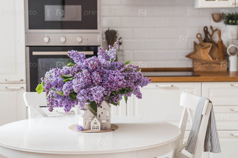 Концепция домашнего комфорта. Большой фиолетовый букет сирен и белых скандинавских домов на столе. На заднем плане интерьер современной белой кухни