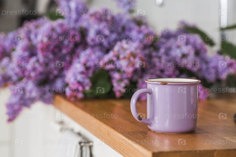 Концепция домашнего комфорта и напитков. Чашка чая или кофе на столешнице кухни. На заднем плане большой фиолетовый букет сирен