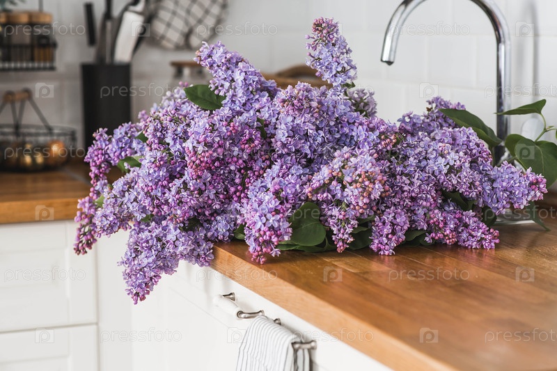 Концепция домашнего комфорта.Большой фиолетовый букет сирен в раковине или раковине на кухне.На заднем плане интерьер современной, стильной и яркой кухни