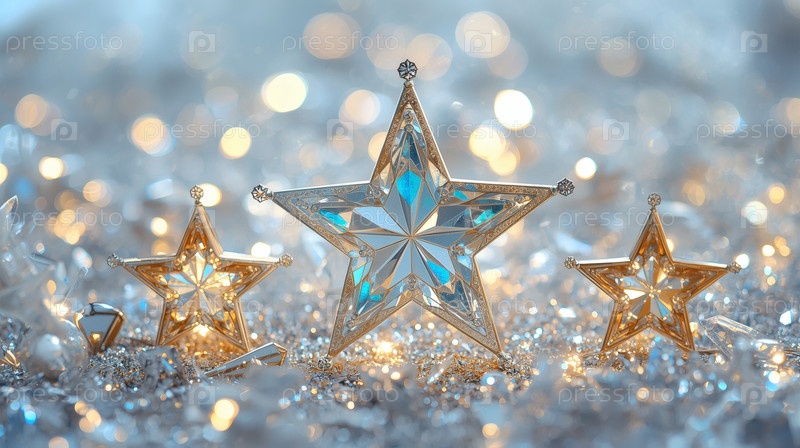 Блестящее золото, ледяные звезды и красивый боке на синем фоне.С Новым годом и Счастливыми Рождествами
