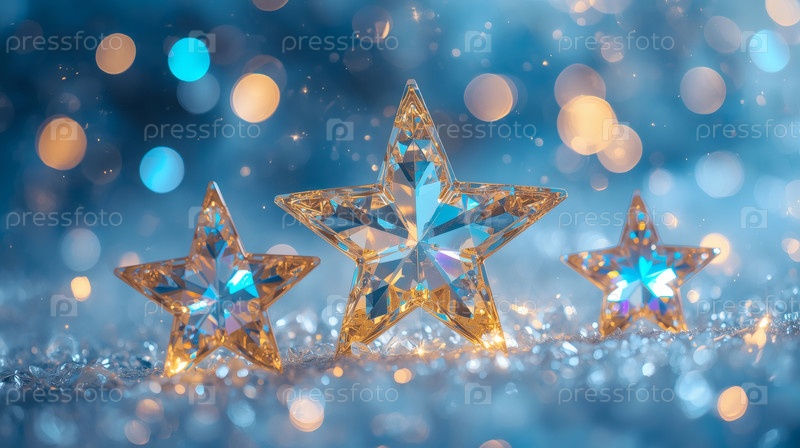 Блестящее золото, ледяные звезды и красивый боке на синем фоне.С Новым годом и Счастливыми Рождествами