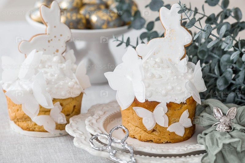 Пасхальный торт с белым кроликом и бабочками, пасхальные яйца со золотыми ветвями эвкалипта на белом кухонном столе. Стильная пасхальная натюрмортизация. Счастливого Пасхи 2026