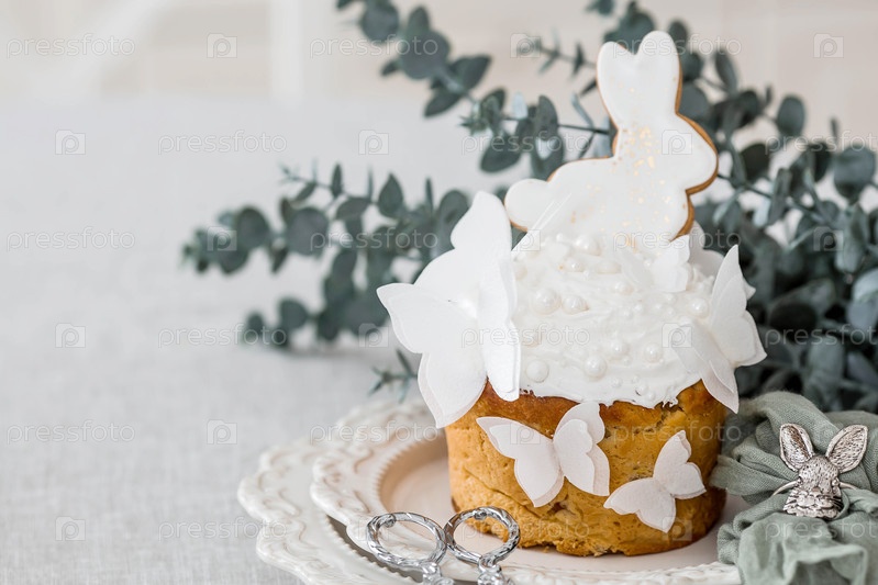 Пасхальный торт с белым кроликом, бабочками и ветвями эвкалипта на белом кухонном столе. Стильные пасхальные натюрморты. Счастливая Пасха 2026