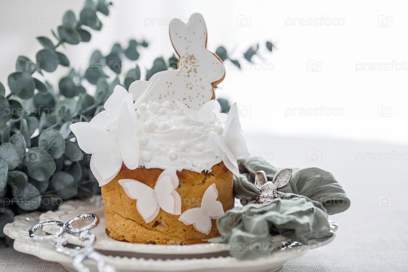 Пасхальный торт с белым кроликом, бабочками и ветвями эвкалипта на белом кухонном столе. Стильные пасхальные натюрморты. Счастливая Пасха 2026
