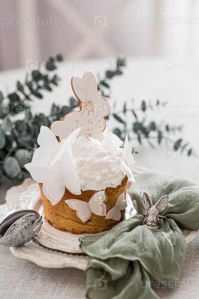 Пасхальный торт с белым кроликом, бабочками и ветвями эвкалипта на белом кухонном столе. Стильные пасхальные натюрморты. Счастливая Пасха 2026