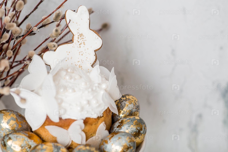 Пасхальный торт с белым кроликом и бабочками, пасхальные яйца со золотыми ветвями ивы на светлом мраморном фоне. Стильная пасхальная натюрморта. Счастливая Пасха 2026