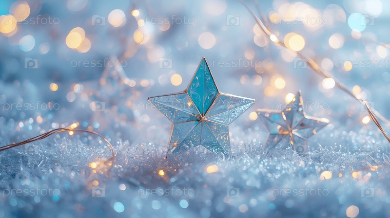 Блестящее золото, ледяные звезды и красивый боке на синем фоне.С Новым годом и Счастливыми Рождествами