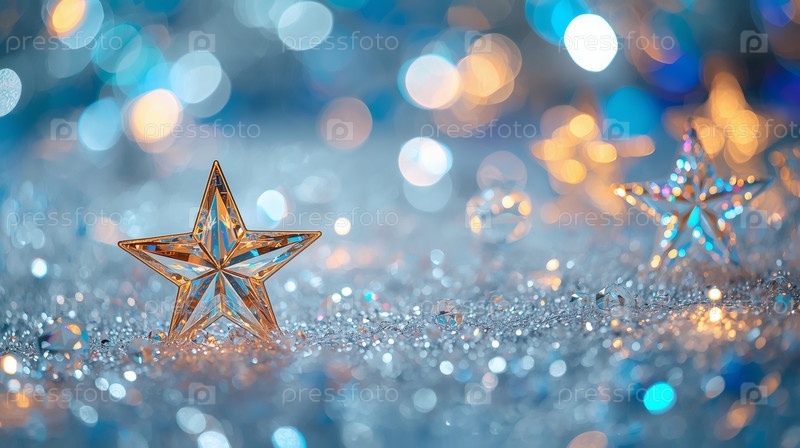 Блестящее золото, ледяные звезды и красивый боке на синем фоне.С Новым годом и Счастливыми Рождествами