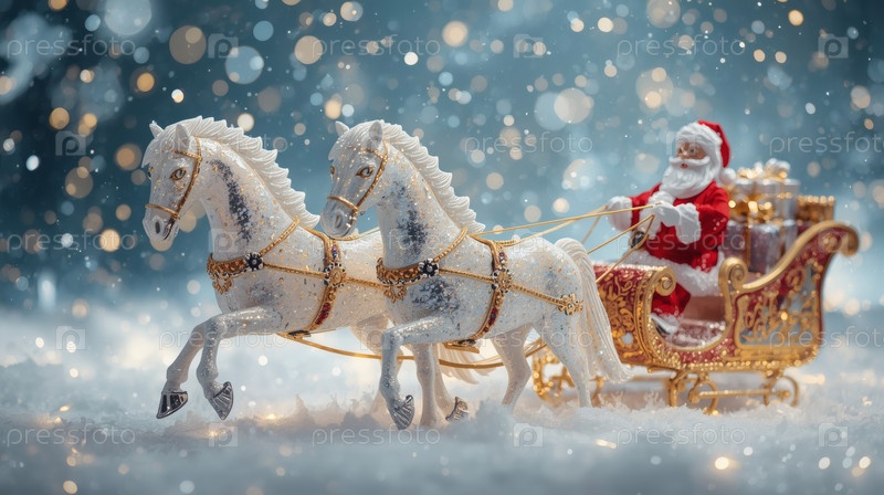 Символ года. Лошади тянут санки с Санта-Клаусом. Роскошный плакат или баннер для вечеринки и Нового года. Счастливый новый год 2026