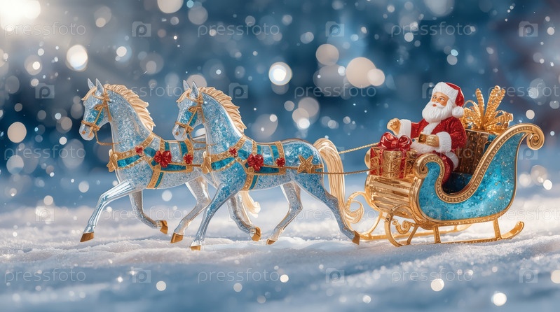 Символ года. Лошади тянут санки с Санта-Клаусом. Роскошный плакат или баннер для вечеринки и Нового года. Счастливый новый год 2026