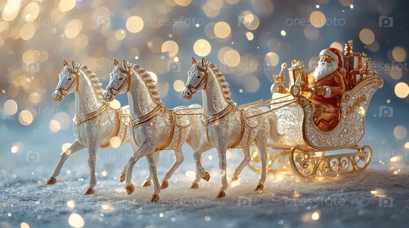 Символ года. Лошади тянут санки с Санта-Клаусом. Роскошный плакат или баннер для вечеринки и Нового года. Счастливый новый год 2026