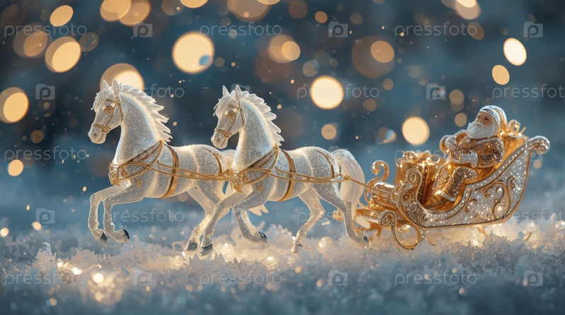 Символ года. Лошади тянут санки с Санта-Клаусом. Роскошный плакат или баннер для вечеринки и Нового года. Счастливый новый год 2026