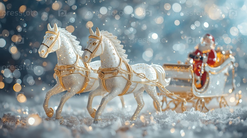 Символ года. Лошади тянут санки с Санта-Клаусом. Роскошный плакат или баннер для вечеринки и Нового года. Счастливый новый год 2026