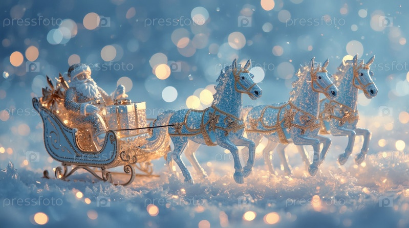 Символ года. Лошади тянут санки с Санта-Клаусом. Роскошный плакат или баннер для вечеринки и Нового года. Счастливый новый год 2026
