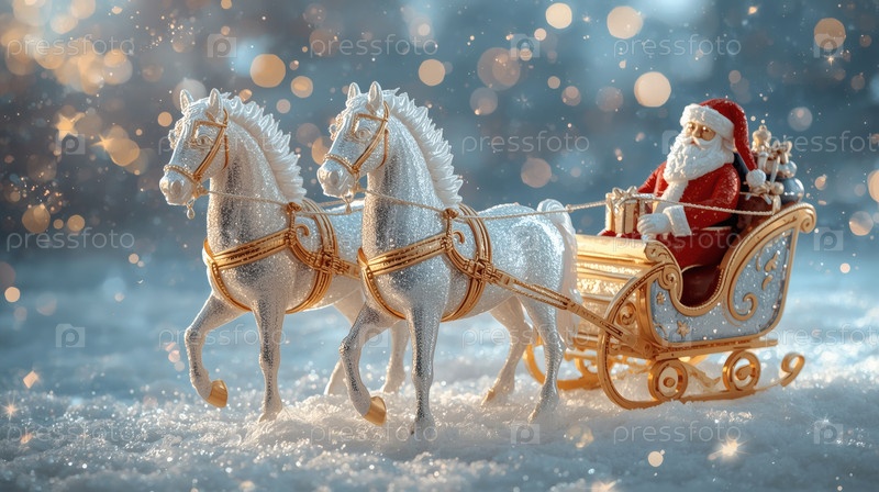 Символ года. Лошади тянут санки с Санта-Клаусом. Роскошный плакат или баннер для вечеринки и Нового года. Счастливый новый год 2026