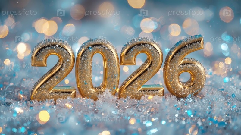 Баннер. блестящие золотые цифры с 2026 года и красивый боке на синем фоне. счастливого нового года и рождества