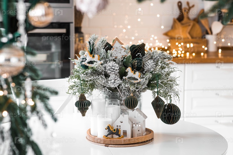 Домашнее украшение на Новый год 2026 г. Букет елей с зелеными игрушками, лошадьми и белыми домами на кухонном столе Рождественские декорации в интерьере