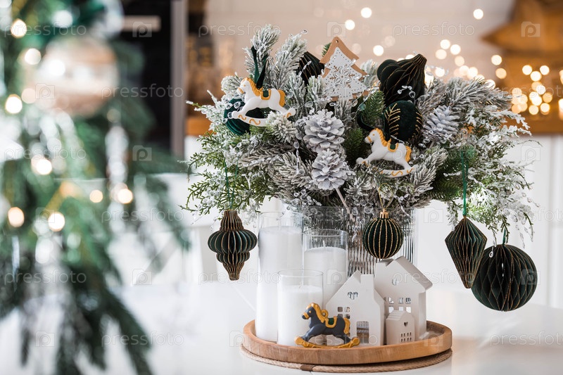 Домашнее украшение на Новый год 2026 г. Букет елей с зелеными игрушками, лошадьми и белыми домами на кухонном столе Рождественские декорации в интерьере