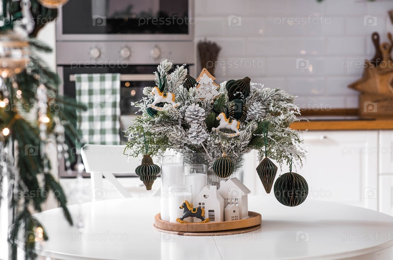 Домашнее украшение на Новый год 2026 г. Букет елей с зелеными игрушками, лошадьми и белыми домами на кухонном столе Рождественские декорации в интерьере
