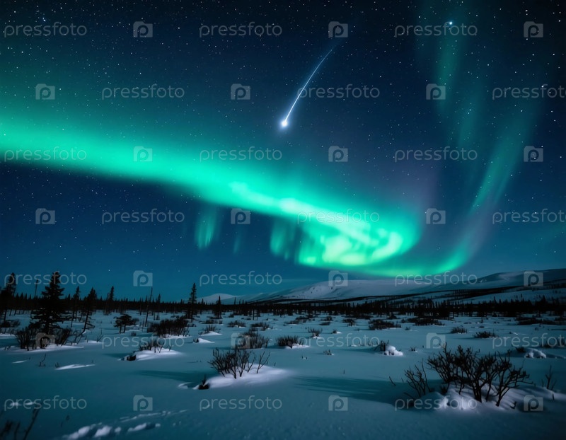 Ярко-зеленые полярные сияния танцуют в ночном небе над снежной тундрой, создавая захватывающую дух праздничную атмосферу рядом с мерцающей кометой Generative AI