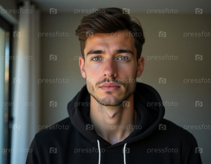 Гражданин Сербии стоит с спокойным поведением в комнате, освещенной мягким естественным светом генеративного ИИ