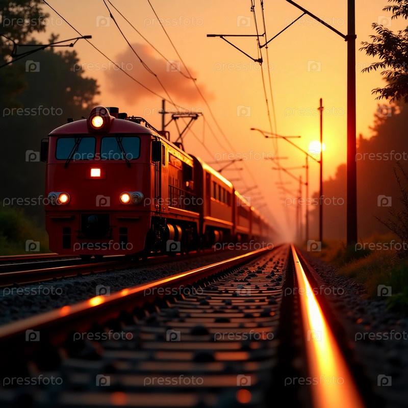 Яркие оттенки рисуют небо, когда смелый поезд скользит вдоль железнодорожных путей, приветствуя рассвет спокойным и увлекательным путешествием
