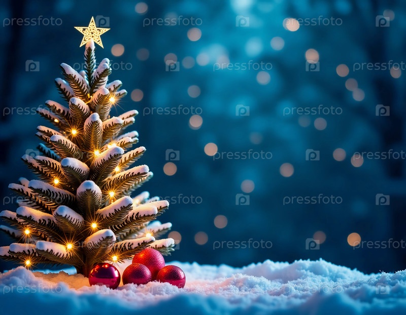Красиво украшенная рождественская елка стоит в безмятежном лесу, мерцающие огни и яркие декорации.Снег окутывает землю, а дух праздника наполняет воздух