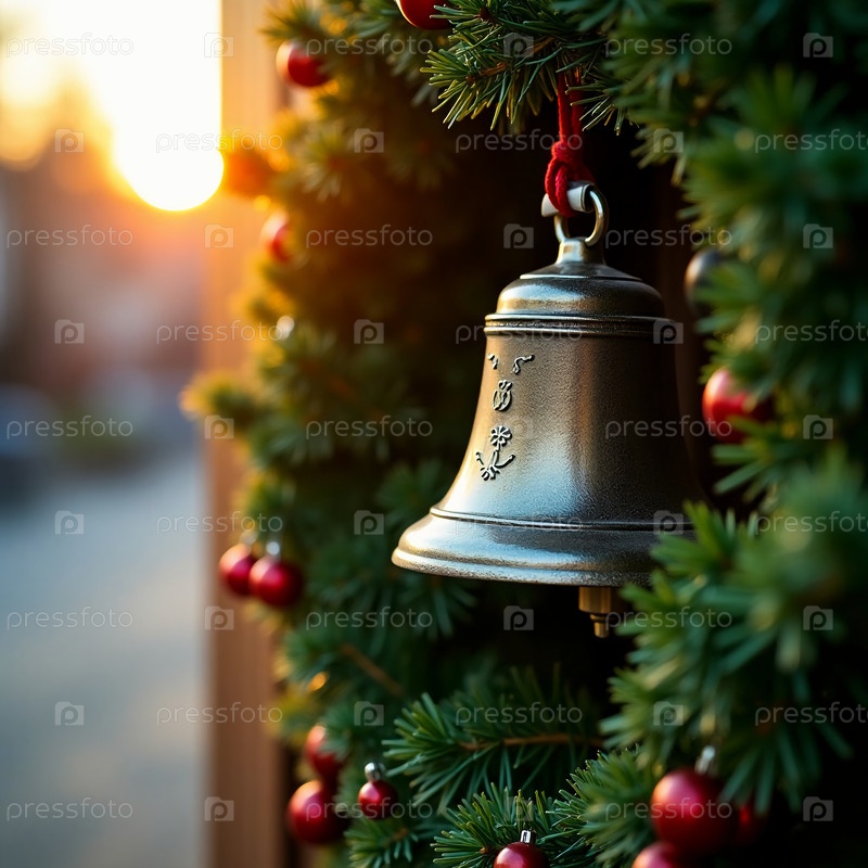 Потрясающий колокол грациозно висит в пышном зеленом венке, украшенном праздничными красными ягодами, освещенных теплым светом угасающего заката на восхитительном рождественском вечере генеративного ИИ