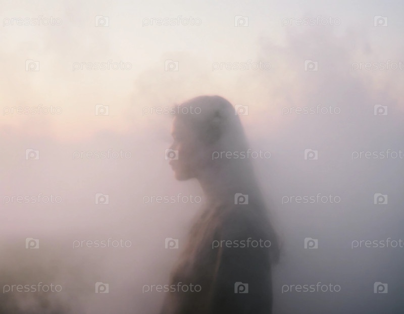 В раннем утреннем свете девушка стоит, окутанная в мягкий туман.Туман вокруг нее создает атмосферу мечты, подчеркивая момент мирного одиночества