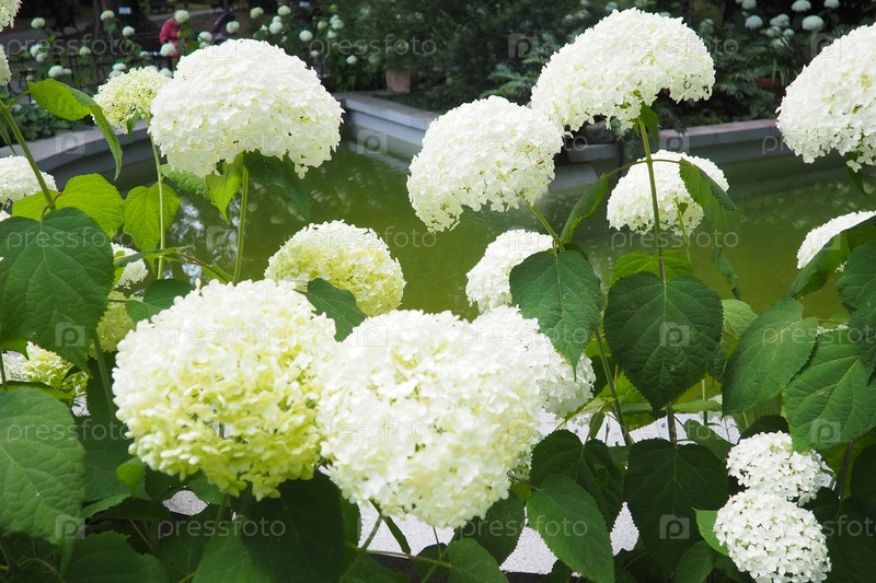 Hydrangea hortensia - род цветущих растений, родом из Азии и Америки.Гортензия является популярным декоративным растением, выращиваемым благодаря своим большим цветникам.Большие белые цветы в саду