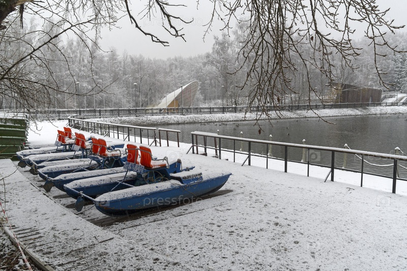 Водные велосипеды на закрытой зимней лодочной станции. пруд в Теплостанском лесном парке, Москва. середина ноября